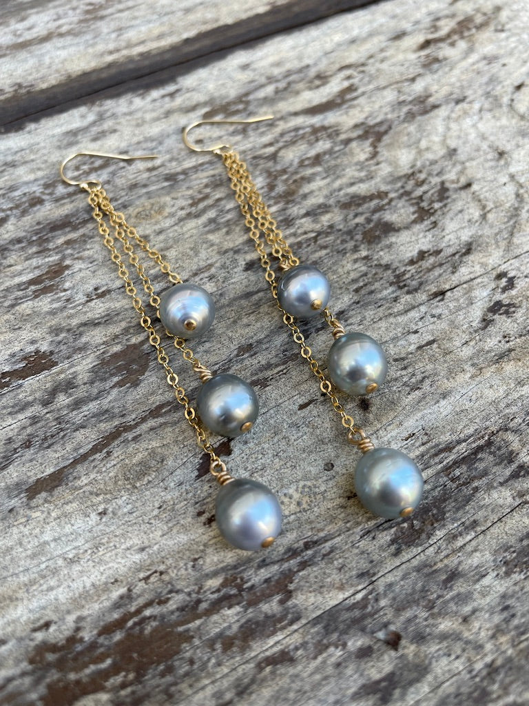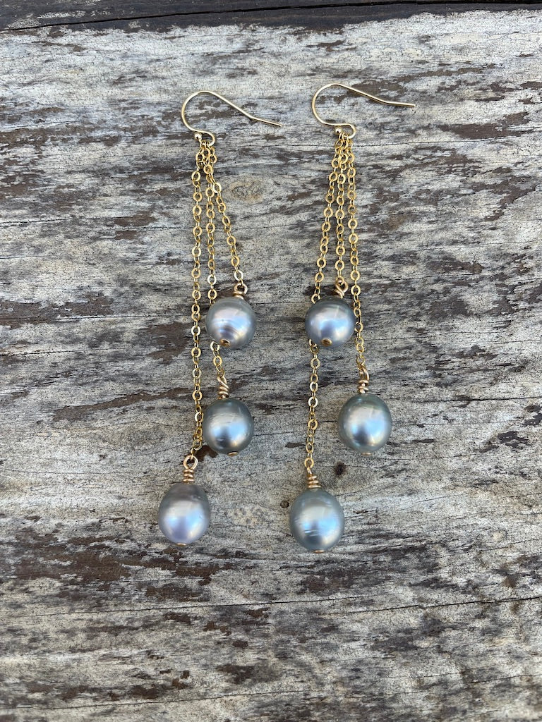 These three tiers of lustrous Tahitian Pearls are a sassy addition to your collection. They dangle 3 3/4" on 14k gold filled chain and earwires.