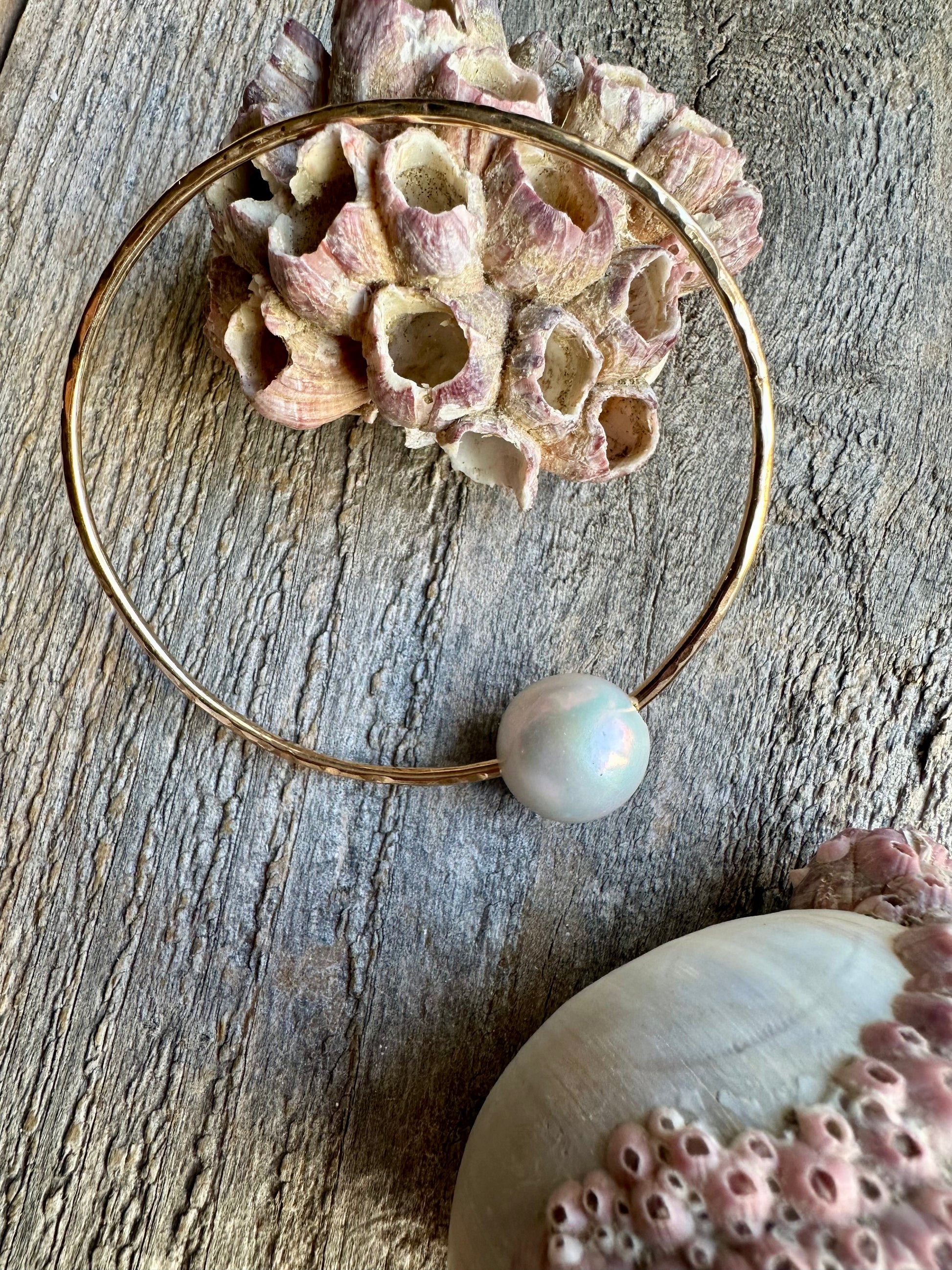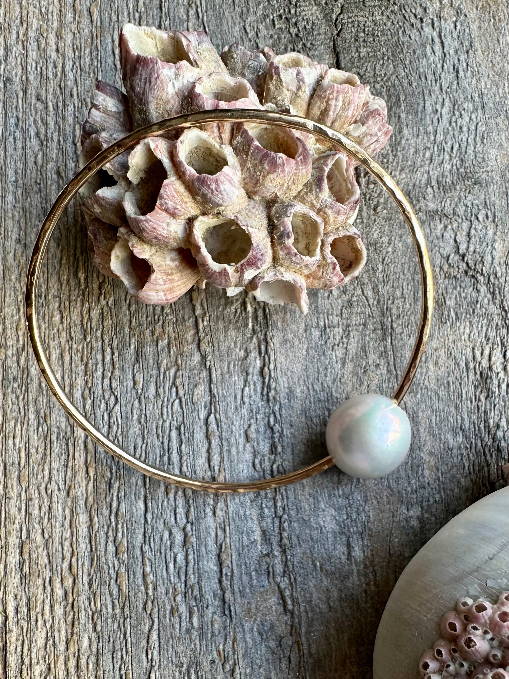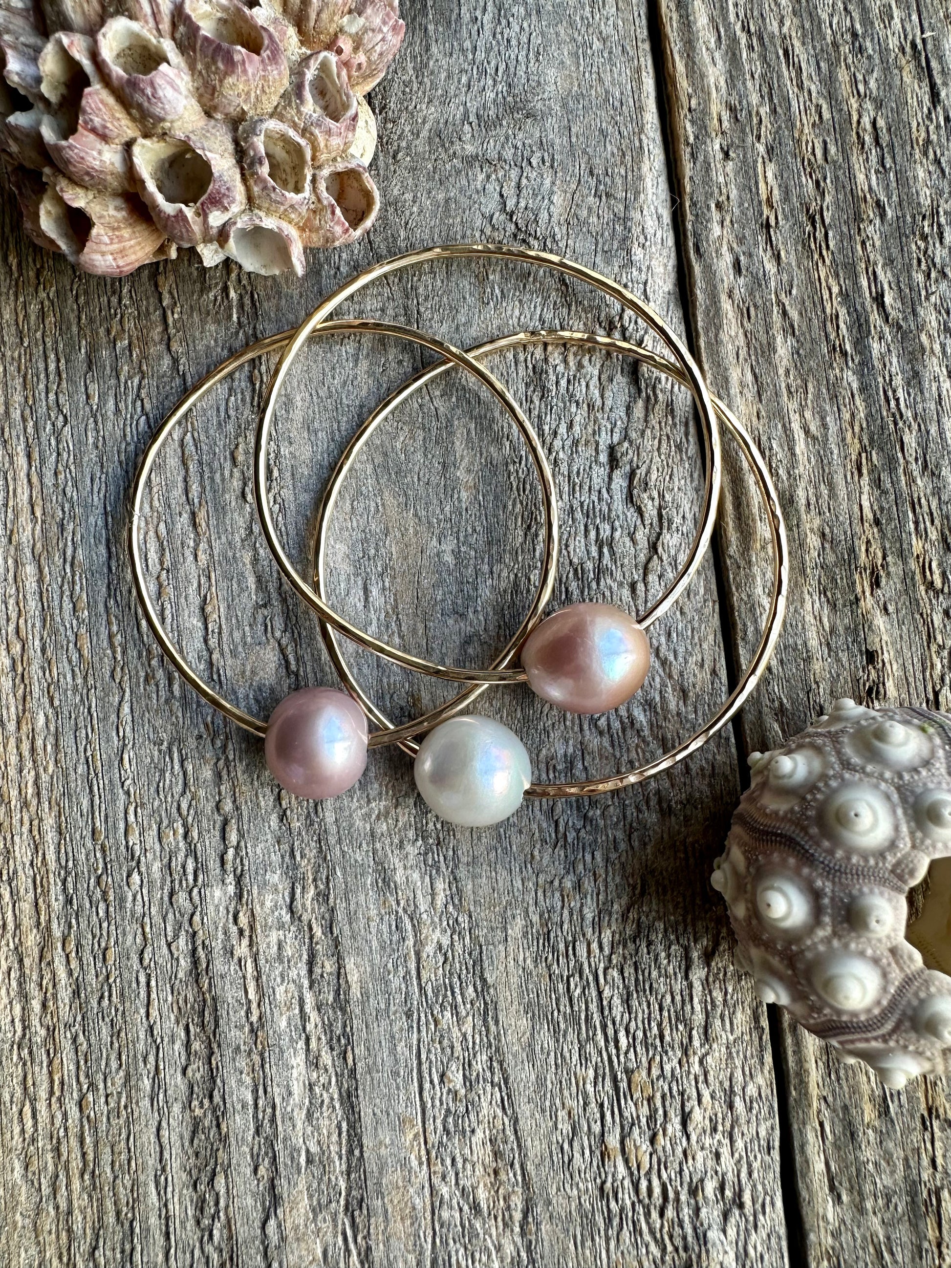 Extraordinary 15mm Fireball Baroque natural pearls on 14K gold filled hand hammered wire bangles. Stack them or wear them as individual statements. Each pearl is unique and has varying shapes and sheens ranging from light pink to opalescent whites. Each piece will be selected intuitively for you upon purchase.