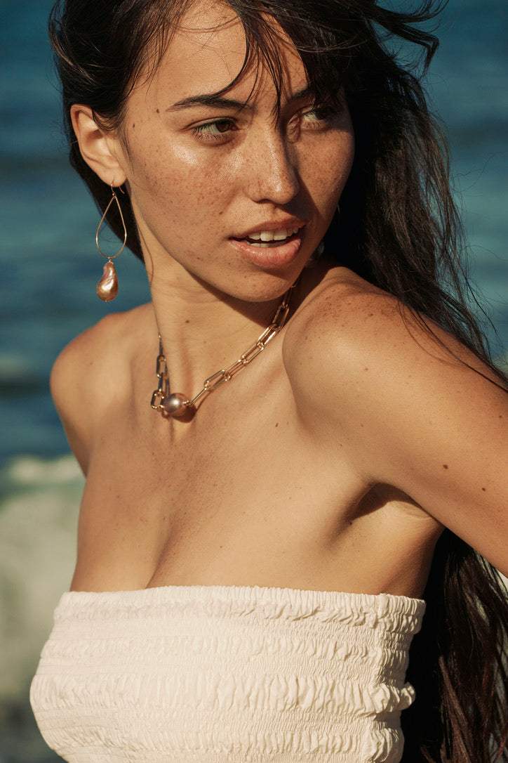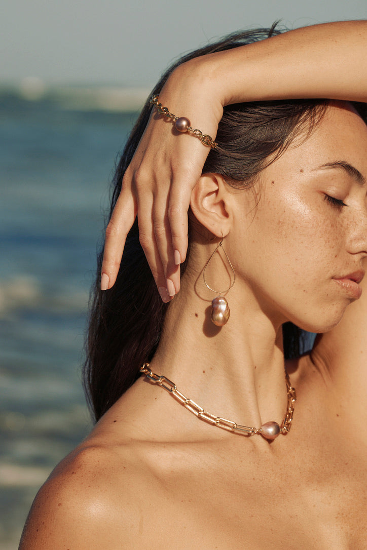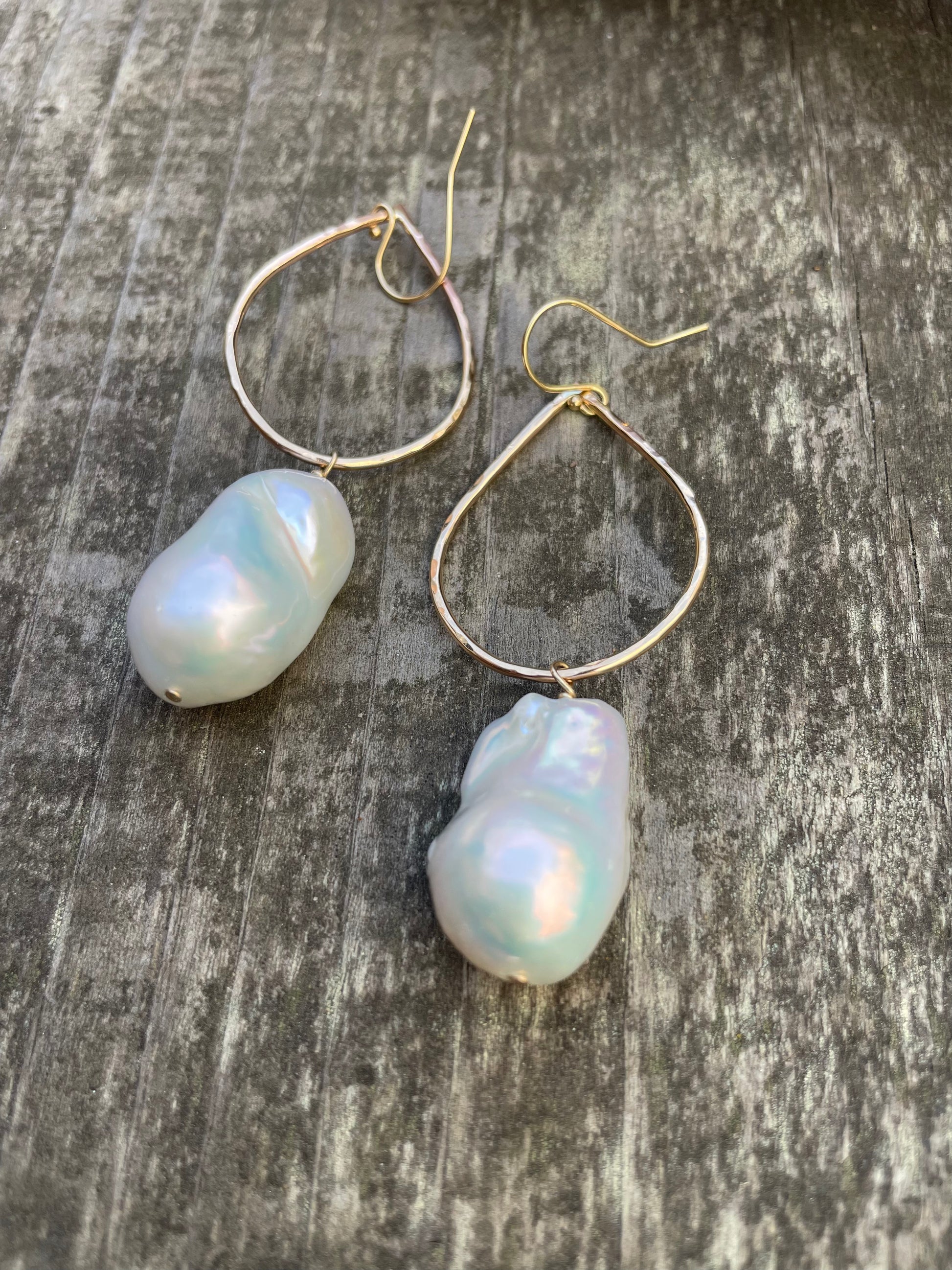 Luminous Flames: Fireball Baroque Pearl Teardrop 14K Gold Filled Hoop Earrings, featuring vibrant Baroque Fireball pearls suspended from exquisite gold-filled wire. These earrings bring a wild and fun beachy glam to any look, infusing it with an irresistible allure and carefree charm.