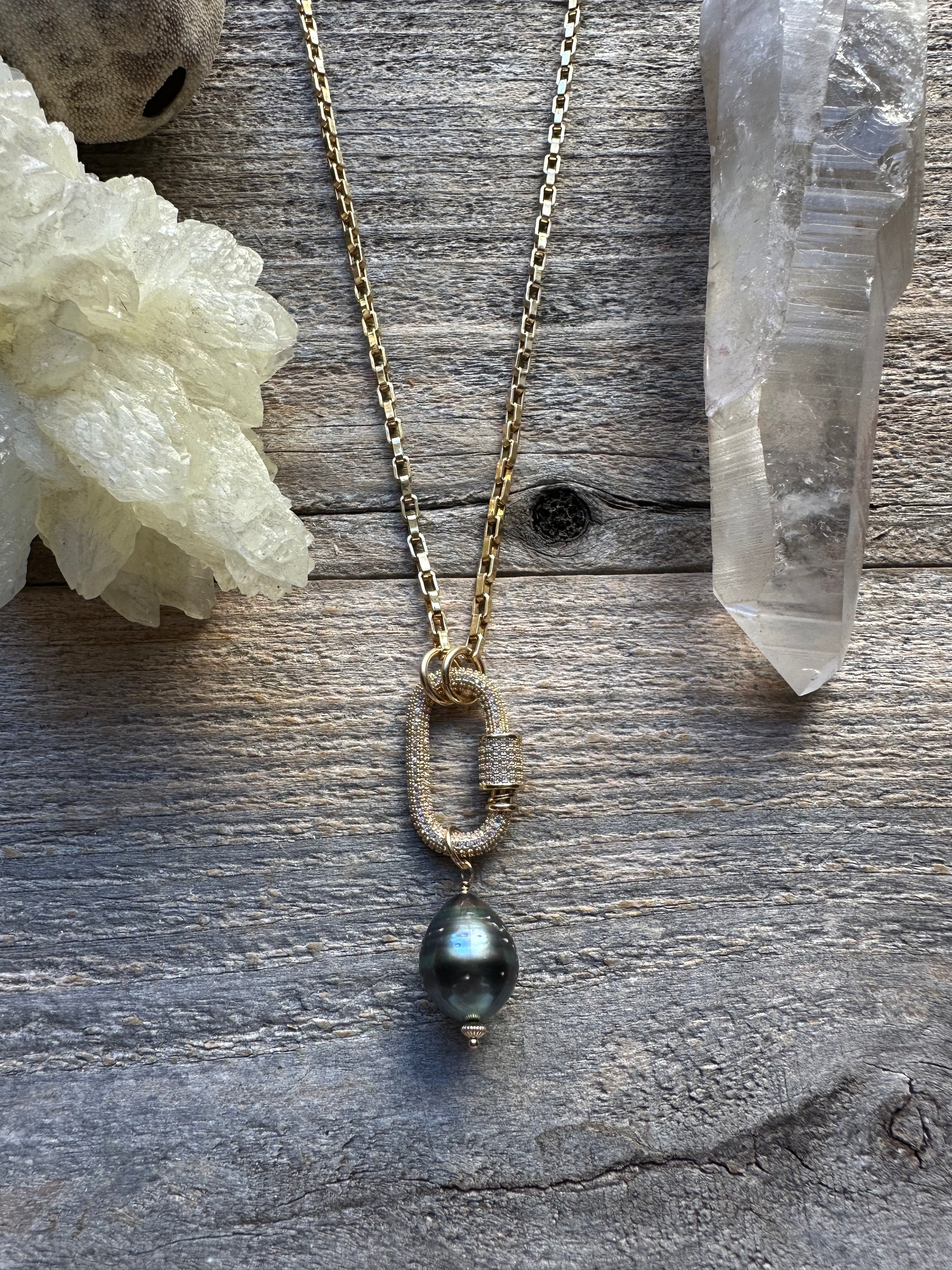 The Lunar Halo Necklace holds the quiet shimmer of moonlight caught between sea and sky. A single Tahitian pearl—dark, iridescent, and endlessly mysterious—hangs from a pavé-set golden carabiner, suspended along a bold square-link chain with the gleam of sunlight on still water.