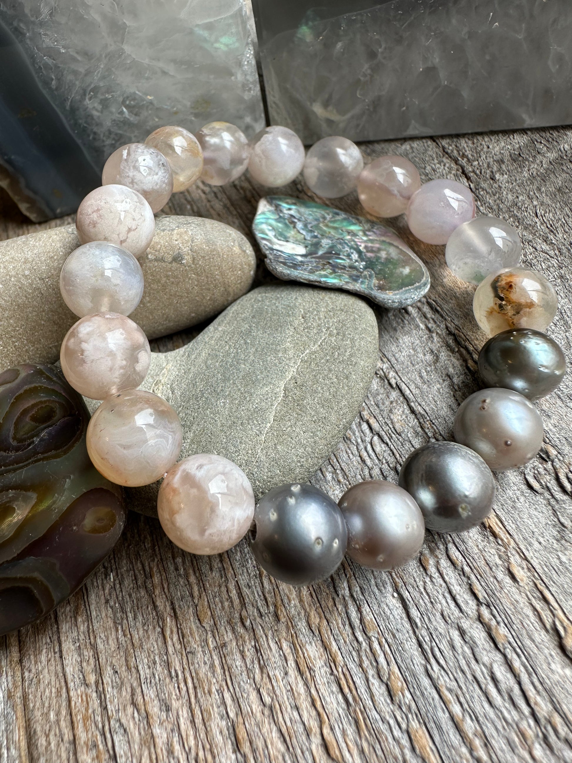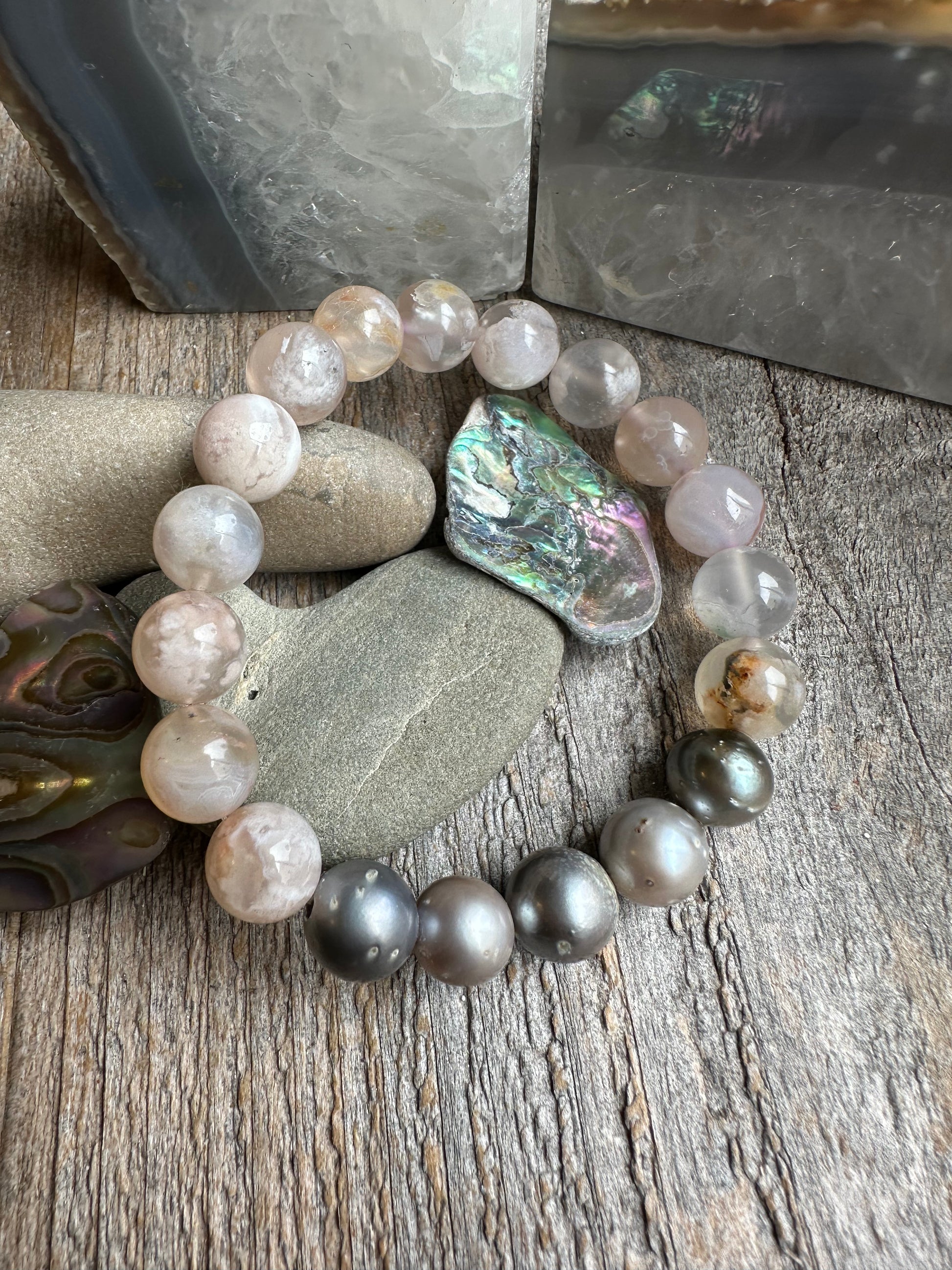 Moonpetal Flower Agate and Tahitian Pearl Stretchy Bracelet