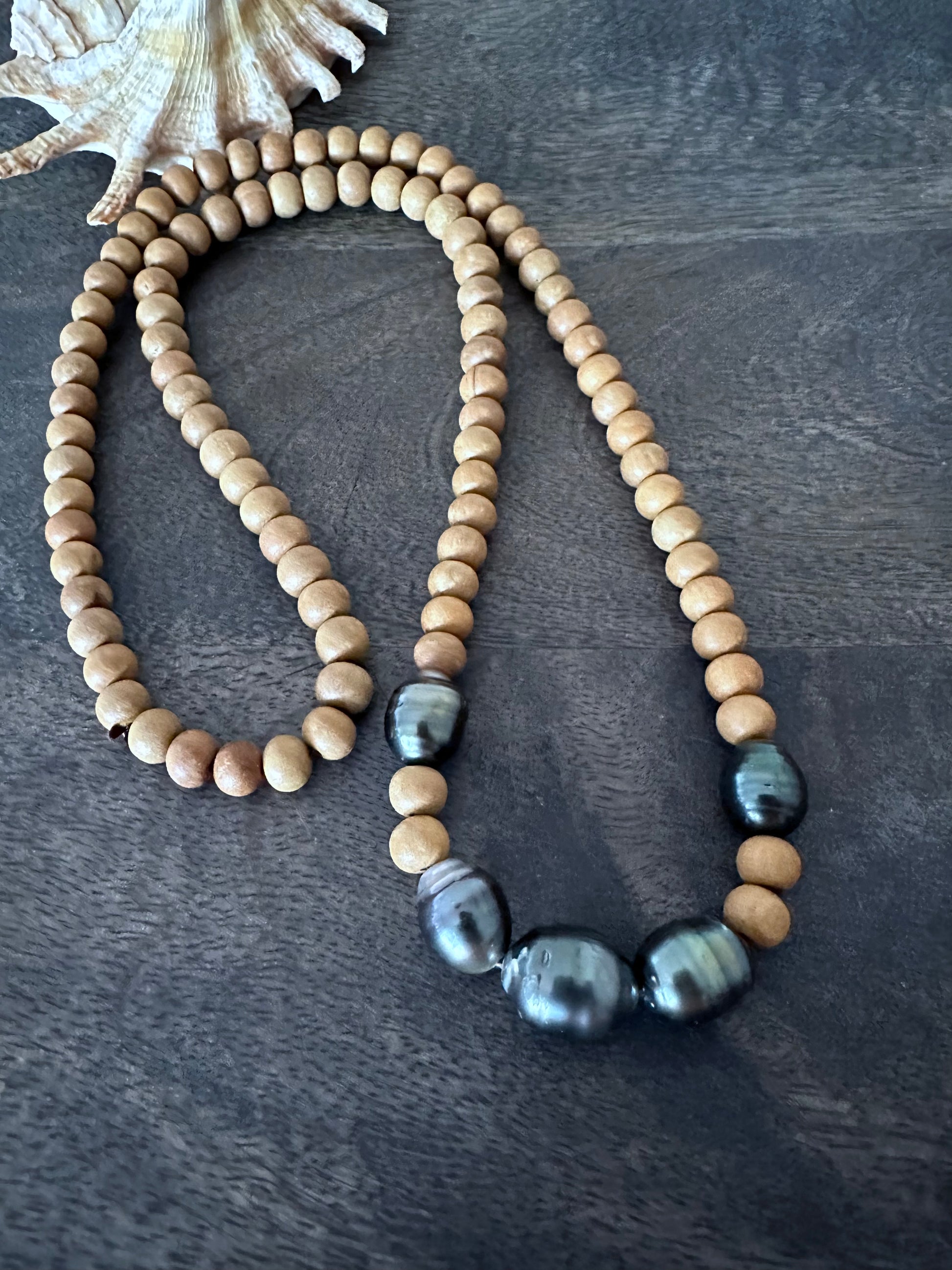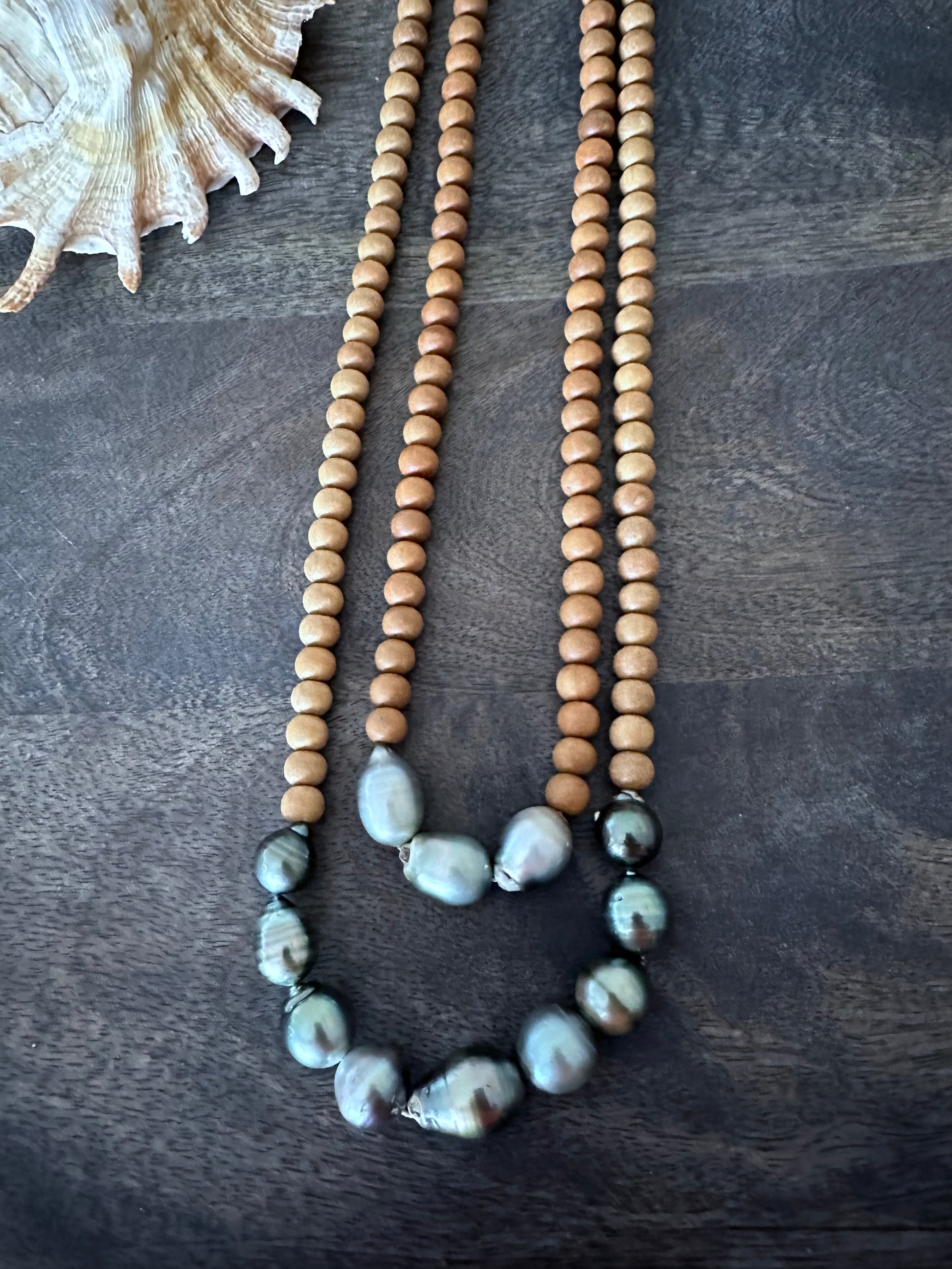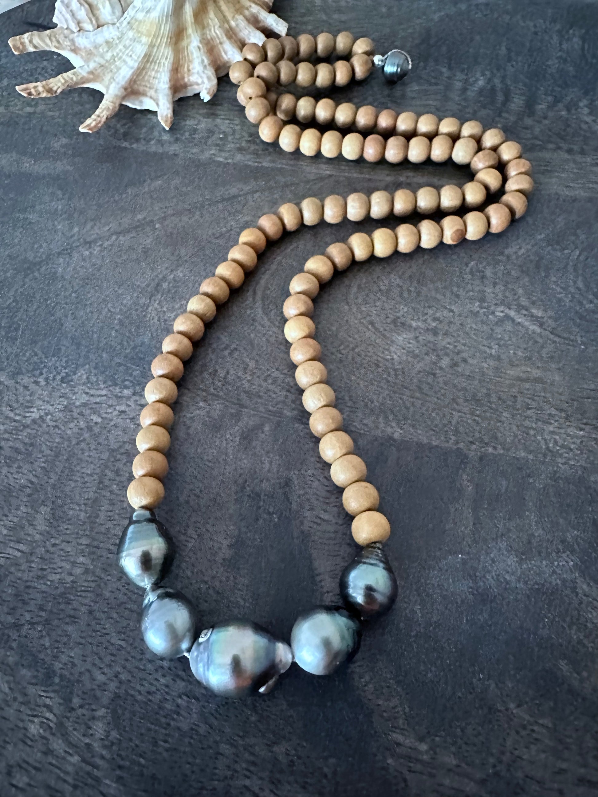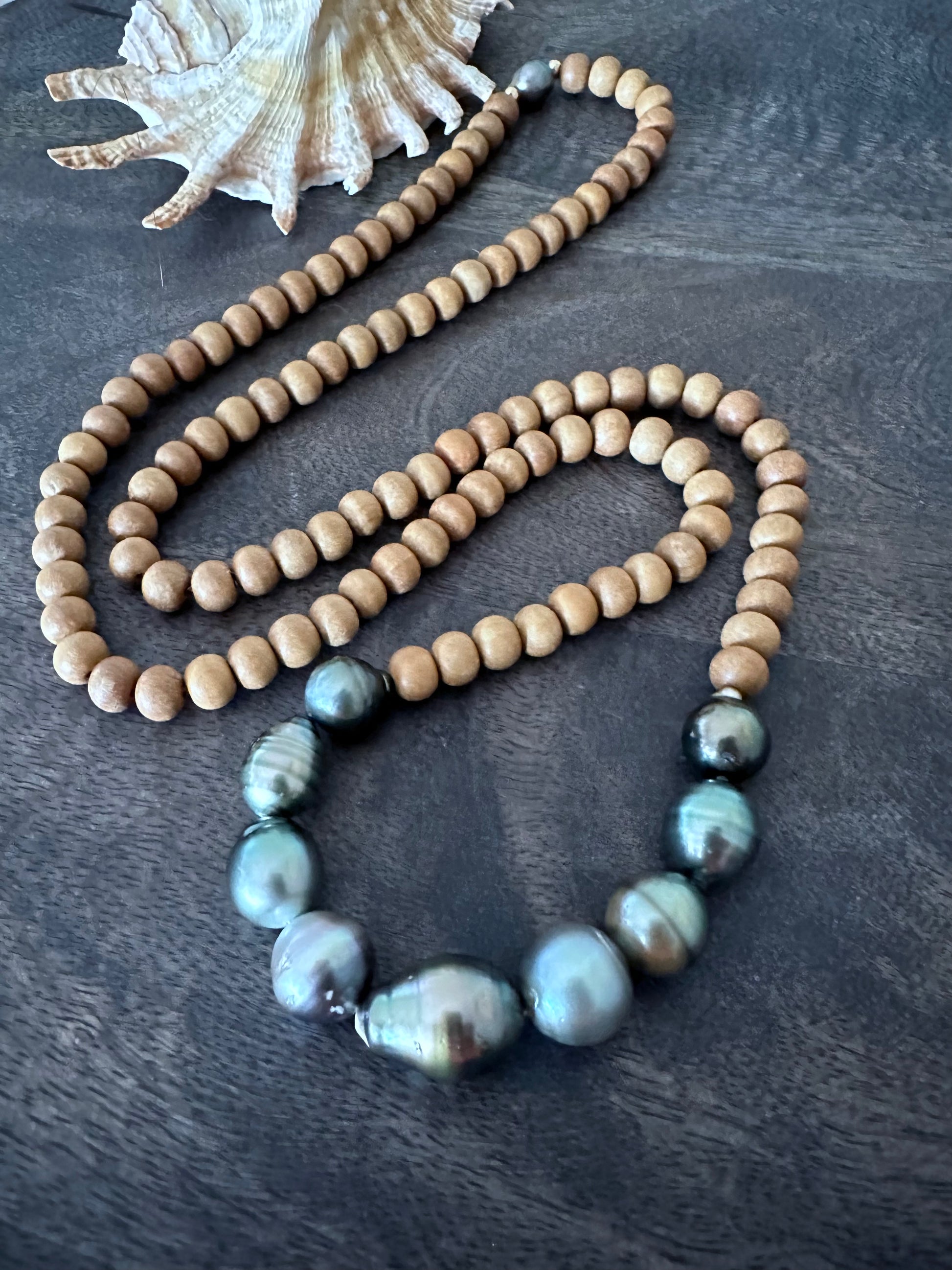 Sacred Tide Choker, a harmonious union of earth and ocean, designed to grace your neckline with elegance and grace. This fragrant necklace features exquisite Tahitian pearls, ranging from 13 to 15mm in size, meticulously hand-drilled and strung alongside hand carved Sandalwood beads.