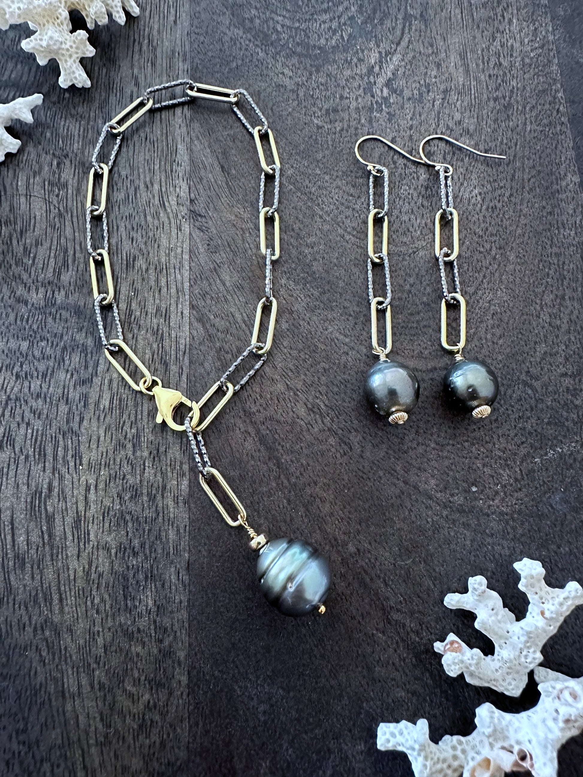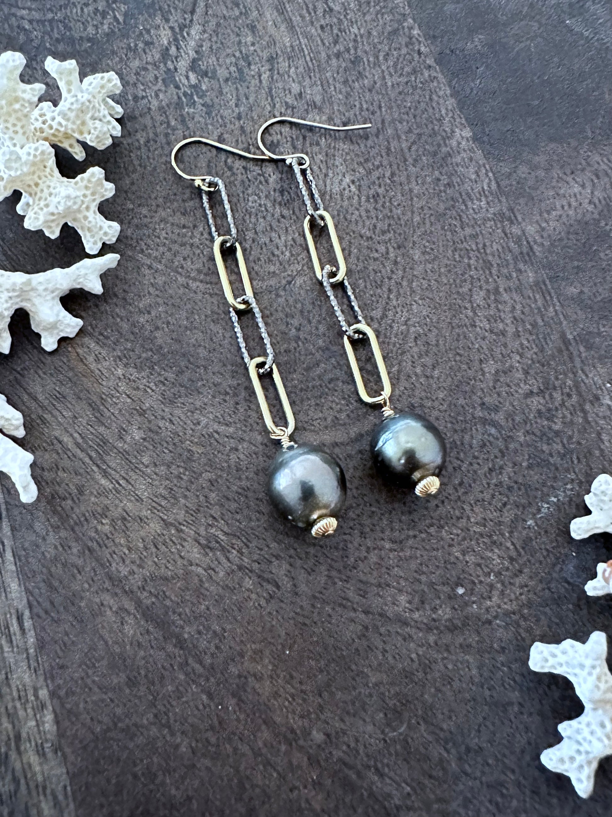 Ocean Alchemy: Radiant Italian Silver and Gold Paperclip Chain Earrings with Tahitian Pearl