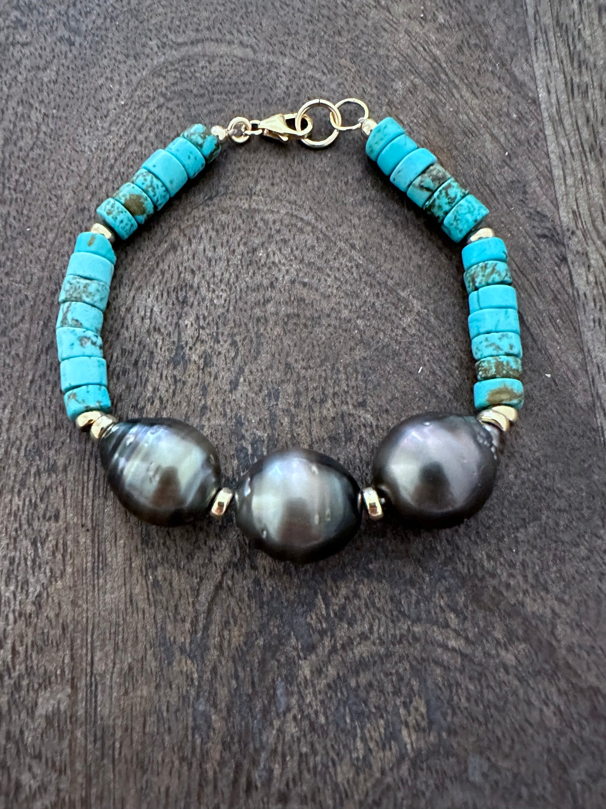 Ocean Breeze: Turquoise and Tahitian Pearl 7.5" Bracelet with Gold Filled Clasp