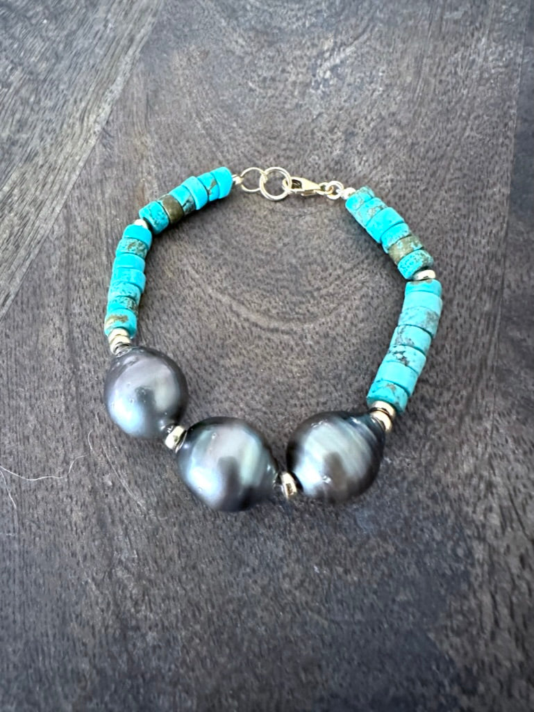 Ocean Breeze Bracelet, a stunning homage to the tranquility of the sea. This bracelet features a trio of divine Tahitian pearls paired with vibrant turquoise beads, capturing the essence of the ocean's depths and the serenity of coastal shores.