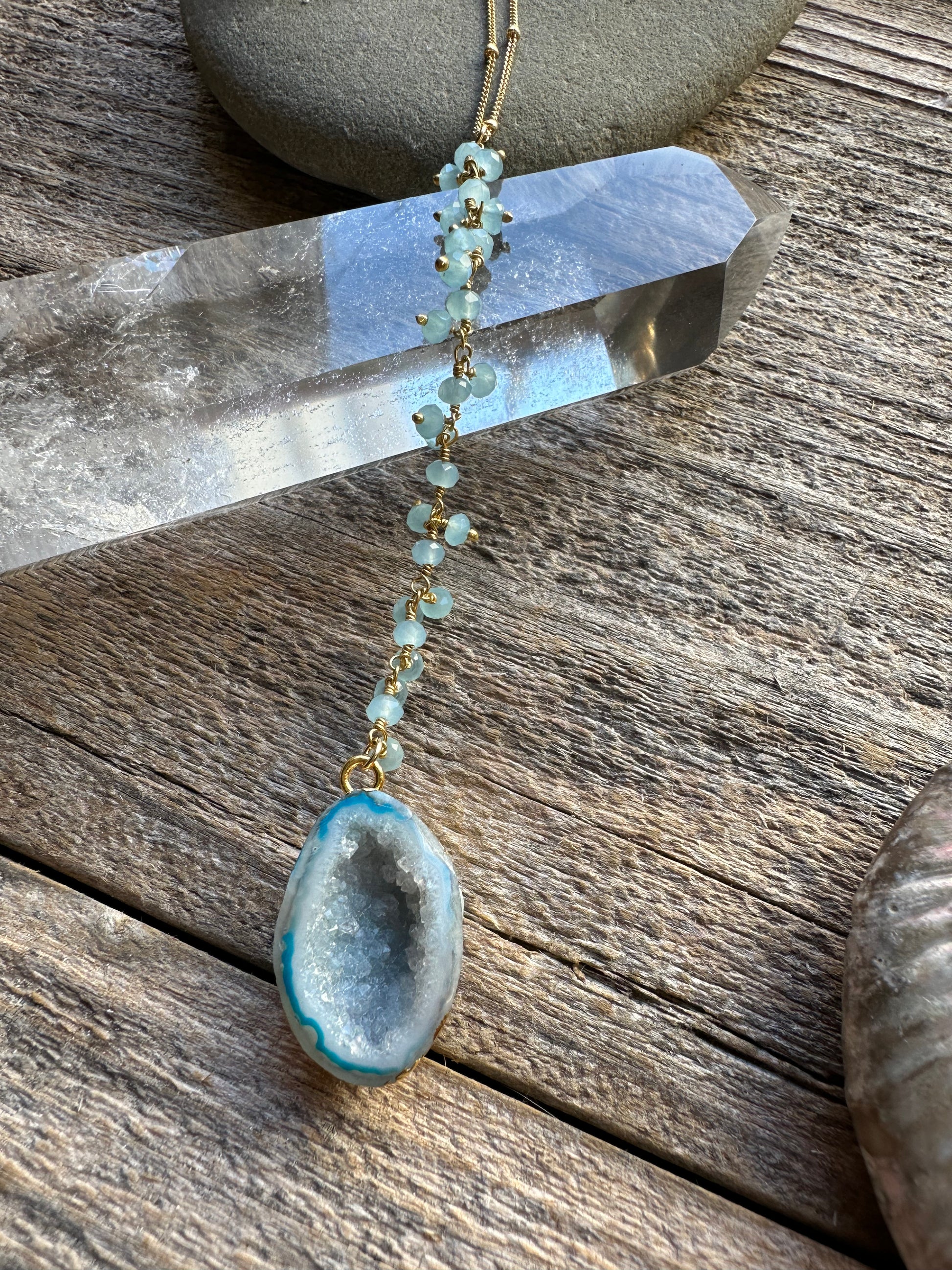 This necklace shimmers with luminous ocean energy. A 20-inch satellite chain holds a 2.5-inch drop of soft blue chalcedony links, ending in a glittering blue druzy crystal kissed with a gold-plated finish. The chalcedony brings the calm flow of water, while the druzy’s crystalline sparkle evokes sunlight dancing across the waves. Together, they create a necklace that is both soothing and radiant — a wearable reminder of the ocean’s beauty and power.