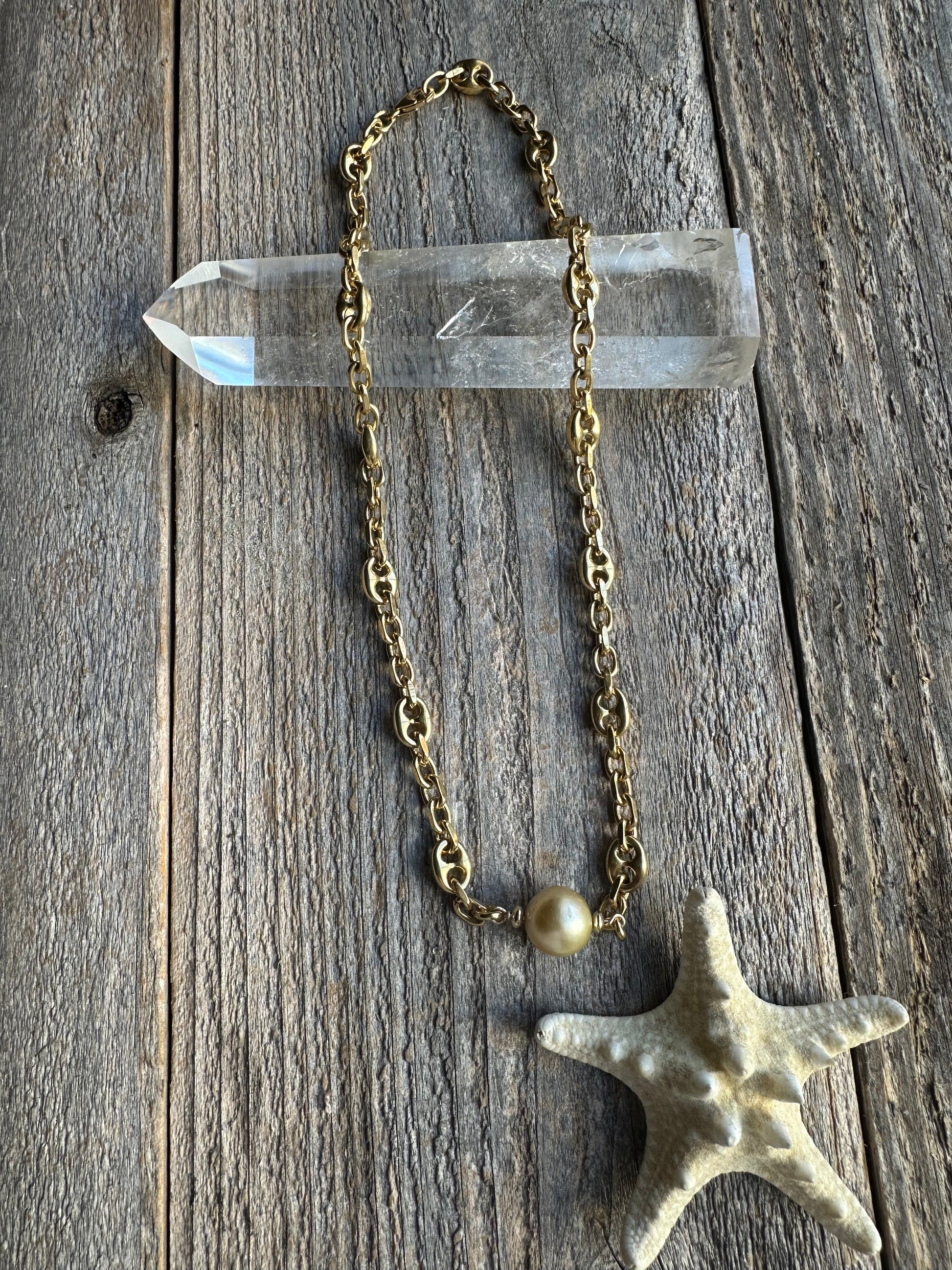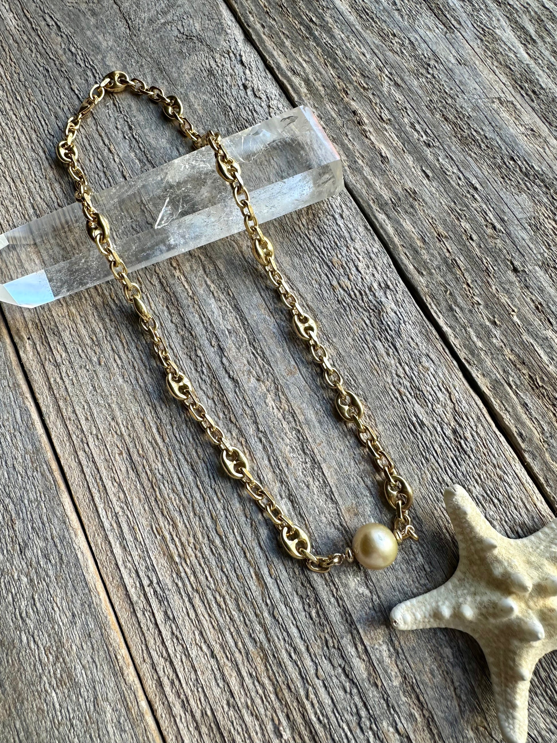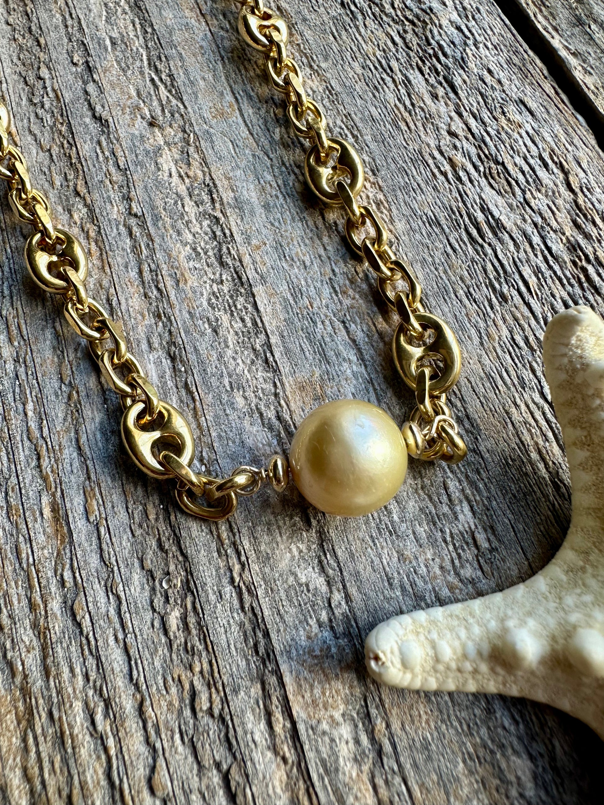 Golden hour, captured in a necklace. The Riviera Soleil features a luminous light yellow South Sea pearl suspended from a 21” puffy gold chain inspired by iconic Cartier links. The pearl’s soft glow and rare hue evoke warmth, luxury, and sun-drenched elegance, while the bold chain adds structure and strength. A piece that feels like sunshine—opulent, radiant, and effortlessly powerful.