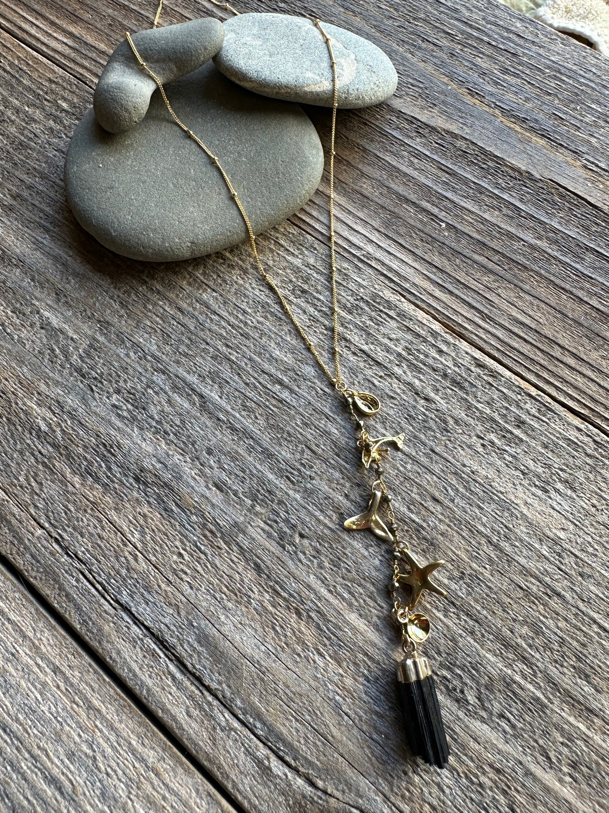 This enchanting necklace is crafted on a 20-inch satellite chain, featuring a dramatic long drop of chain that holds five delicate, sea-themed charms. Each charm is a tiny ode to the ocean, offering a playful shimmer and movement as they cascade down the chain. At the end of the drop rests a raw black tourmaline pendant — bold, grounding, and protective. Together, the ocean’s whimsy and the stone’s earthy strength create a striking talisman that carries both beauty and intention, perfect for layering or wearing as a standout piece.