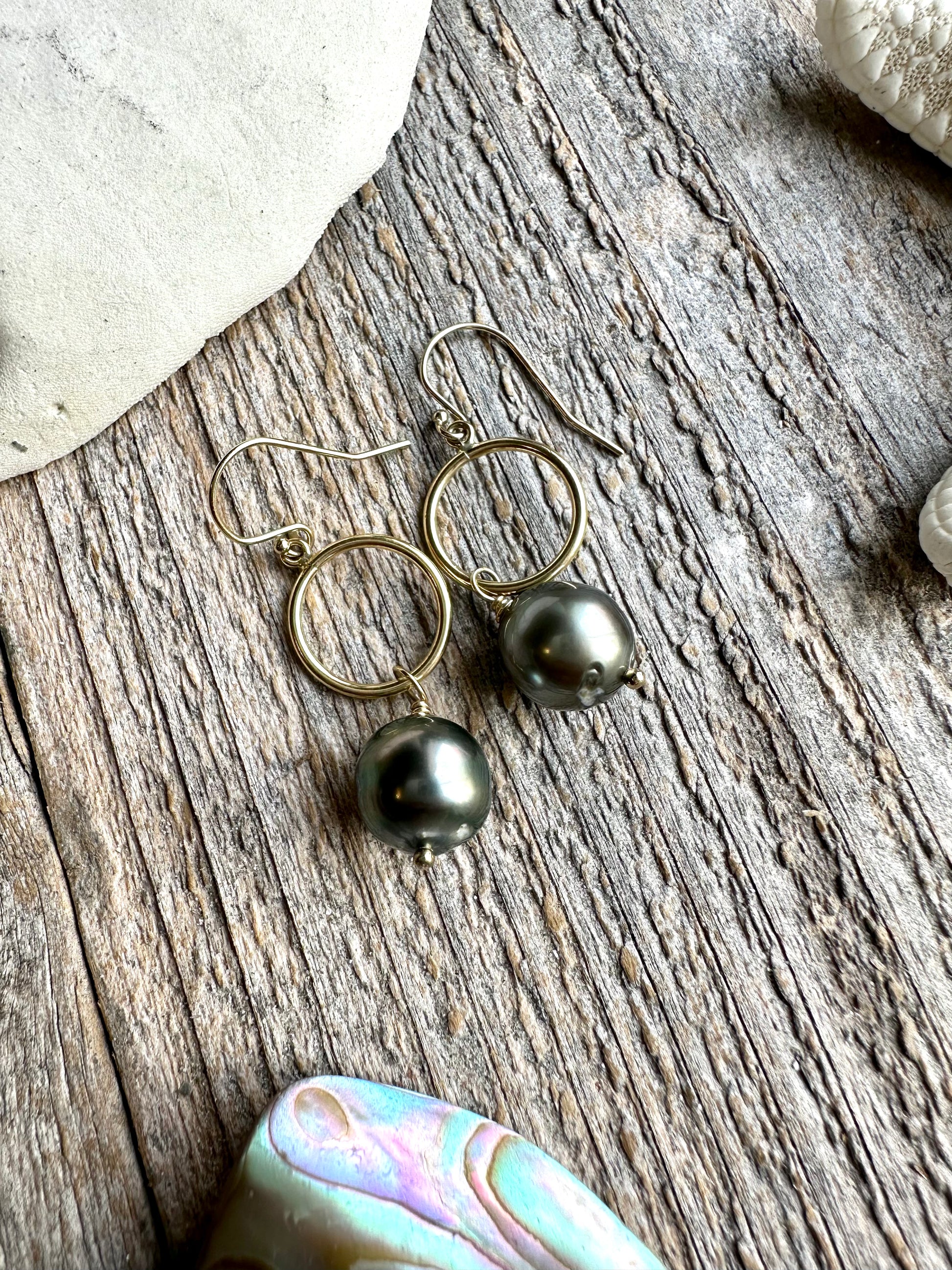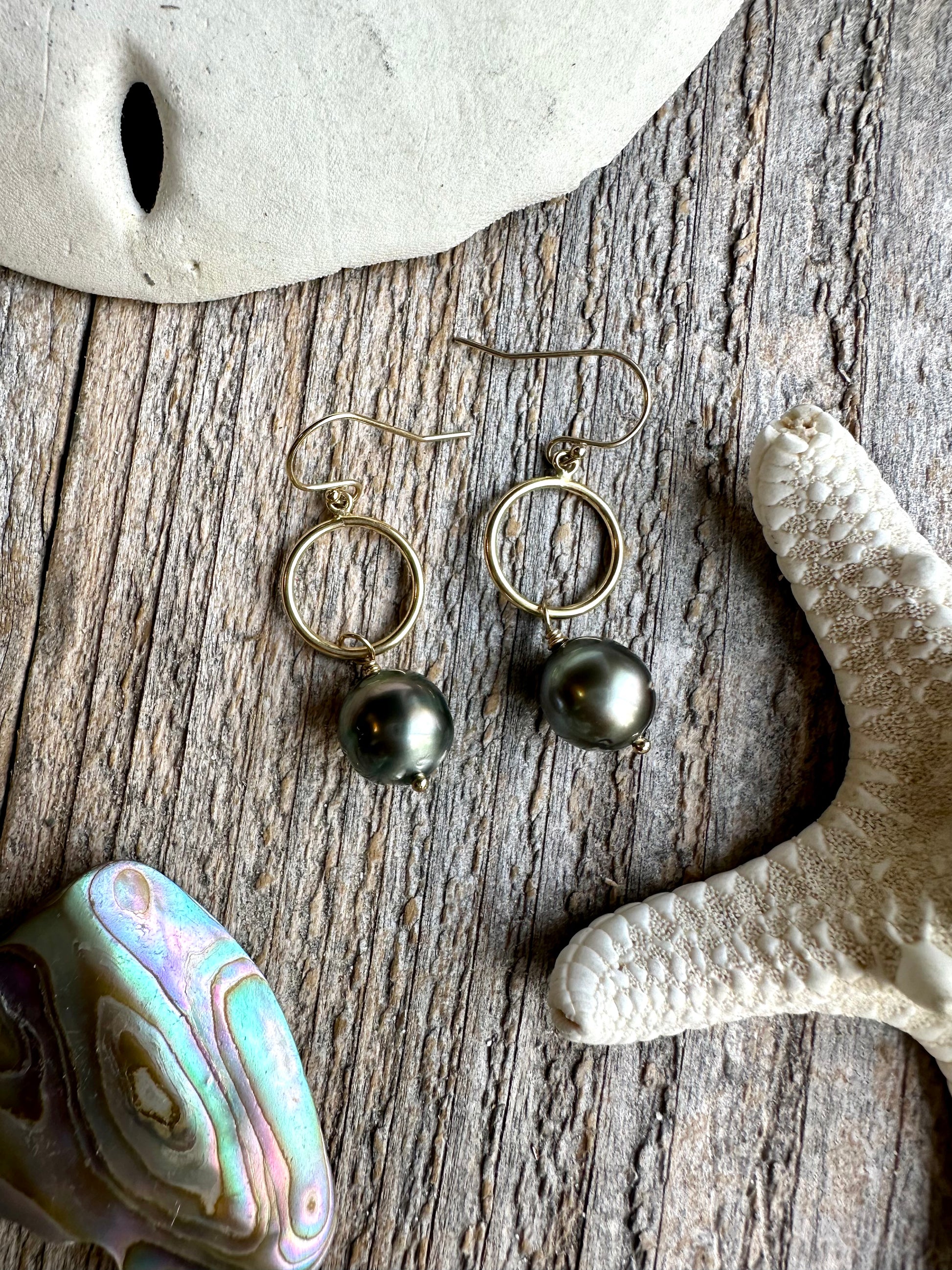 The Sunset Drop Earrings capture the quiet radiance of twilight—when the sky shifts into deep gold and the sea reflects a spectrum of soft, luminous tones. Unique Tahitian pearls, rich with natural texture and iridescent overtones, hang gracefully from warm gold-filled circles, creating a fluid silhouette full of movement and light. Elegant yet grounded, these earrings are a tribute to the ocean’s mysteries and the golden hour’s fleeting beauty. 1.5" Size.