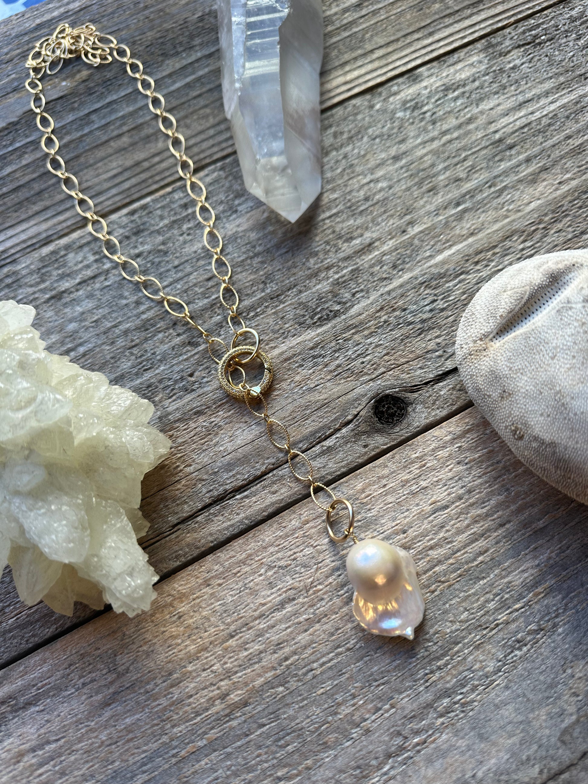 A single, luminous fireball pearl — one of extraordinary shape and radiance — rests at the center of the Solstice Lariat, suspended from a circular pavé-encrusted link on a large gold-filled oval chain. Its surface glows with layers of soft iridescence, reflecting the mystery of moonlight over water, each curve catching and scattering light in its own language.
