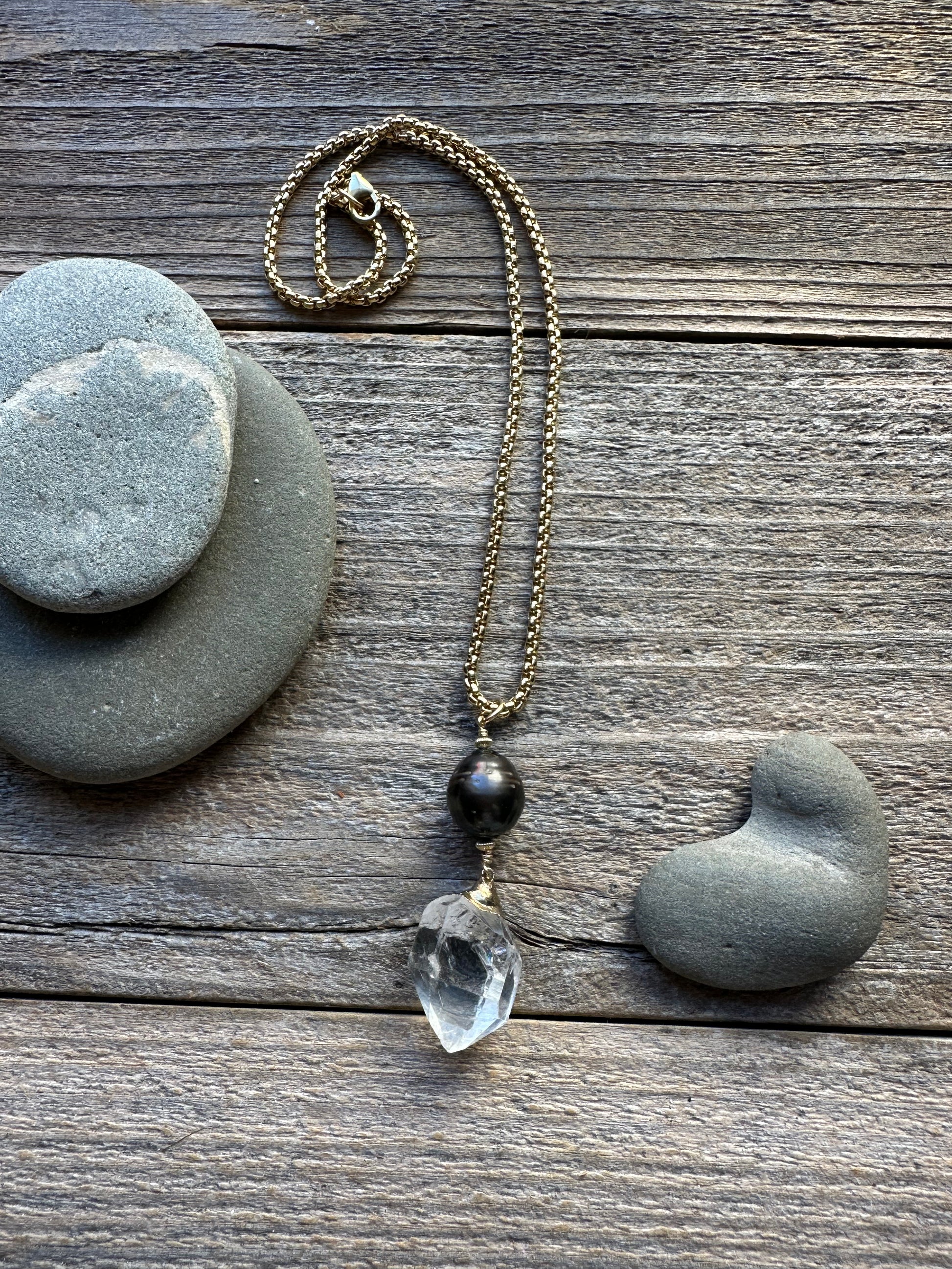 Starhaven Tahitian Pearl and Guilded Herkimer Diamond Necklace